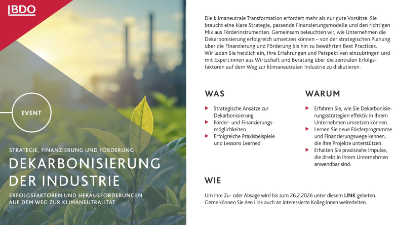 Unser Mitglied, BDO Wien, lädt zur kostenfreien Teilnahme an der Veranstaltung „Dekarbonisierung der Industrie – Erfolgsfaktoren und Herausforderungen auf dem Weg zur Klimaneutralität“ ein. Im Mittelpunkt stehen praktische Zugänge und Erfahrungen aus der Unternehmenspraxis, die Orientierung für die nächsten Schritte geben.